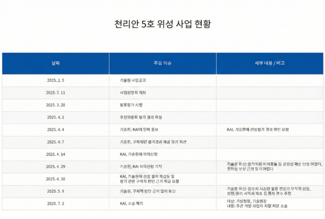 하지만 같은해 7월 LIG넥스원과 경쟁했던 KAI는 ▲선정평가위원장의 이해충돌 ▲시스템·본체와 무관한 실적 인정 및 신청자격 완화 ▲경쟁사 대비 개발역량 고려시 납득불가한 평가 결과 등을 문제삼아 서울행정법원에 기상청·기술원을 상대로 주관 연구 개발 사업자 지정처분 취소 소송을 제기했다.
