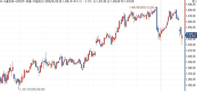 베선트 장관의 발언에 달러-엔 환율은 급등했고, 달러-원 환율도 이에 동조해 장중 고점인 1,438.00원까지 치솟았다.