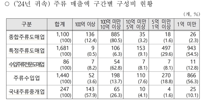2024년 기준 특정주류도매업체의 54.5%(943곳), 주류수입업체의 56.3%(866곳)가 연 매출 1억원 미만으로 집계됐다. 전년도인 2023년에도 각각 52.3%, 57.5%로 절반을 넘겼으며, 1년 사이 오히려 영세 업체 비중이 확대됐다.