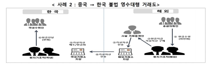 또 다른 사례에서는 중국 내 송금 의뢰인들이 현금을 건네고, 이를 사설 중개인을 통해 가상자산으로 바꾼 뒤 한국으로 전송했다. 한국에서는 이를 현금화해 면세품 구매 자금으로 제공했다. 가상자산 거래가 금지된 중국의 제도적 환경을 악용한 수법으로, 그 규모는 2,443억 원에 이르렀다.