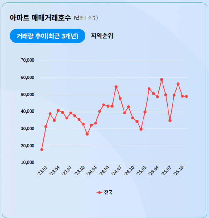 실제 거래 흐름 역시 뚜렷한 회복세로 보긴 어렵다. 한국부동산원에 따르면 최근 3년간 전국 아파트 매매 거래는 월별 변동성이 큰 가운데 추세적 증가 흐름을 형성하지 못하고 있다.