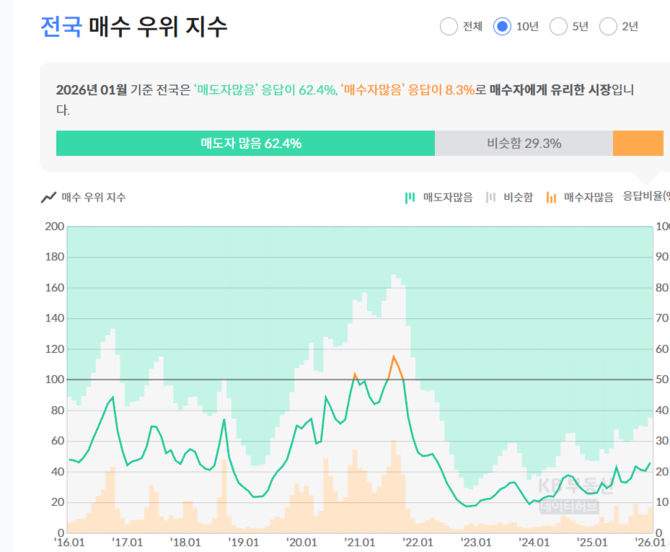 시장 심리 역시 관망 흐름을 뒷받침한다. KB부동산에 따르면 2026년 1월 기준 전국 매수우위지수는 기준선(100)을 밑도는 흐름이 이어지며 매수세 위축 국면이 지속되고 있다. 같은 기간 ‘매도자 많음’ 응답은 62.4%에 달한 반면 ‘매수자 많음’은 8.3%에 그쳐 수요보다 공급 심리가 우위에 있는 시장 구조가 형성된 것으로 나타났다.