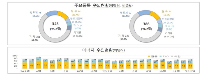 이 기간 수입액은 386억 달러로 전년 동기 대비 11.7% 증가했다. 품목별로는 반도체(19.2%)와 반도체 제조장비(28.5%) 수입이 늘었으며, 원유·가스·석탄 등 3대 에너지 수입액은 10.6% 증가했다. 반면 기계류(-6.0%) 수입은 줄었다.