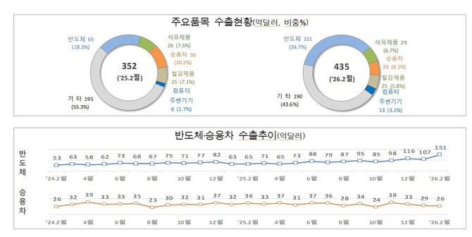 23일 관세청이 발표한 ‘2026년 2월 1~20일 수출입 현황(잠정치)’에 따르면, 이 기간 수출액은 435억 2,000만 달러로 지난해 같은 기간보다 23.5% 늘었다. 이 기간 조업일수는 13.0일로 전년 동기(15.5일)보다 2.5일 적었으나, 이를 고려한 일평균 수출액은 33억 5,000만 달러를 기록해 전년(22억 7,000만 달러) 대비 47.3% 증가했다.