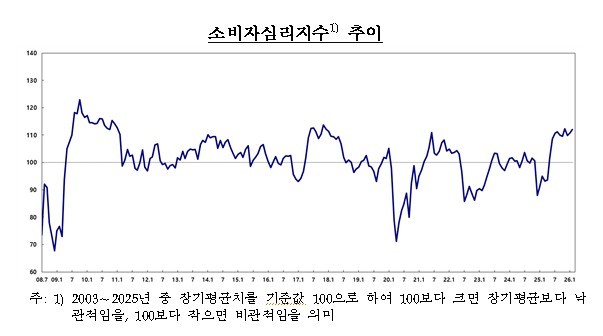 2월 소비자심리지수(CCSI)는 112.1로 전월보다 1.3p 상승했다. 반도체를 중심으로 한 수출 호조와 증시 활황이 지속되면서 두 달 연속 올랐다.