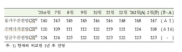 6개월 후 금리 수준을 예상하는 금리수준전망지수(105)는 시장금리와 시중은행의 대출금리 상승 등의 영향으로 1p 올랐다. 기대인플레이션율 가운데 '향후 1년'의 소비자물가 상승률 전망치는 2.6%로 전월과 같았다.