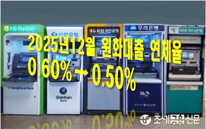금융감독원은 24일 '2025년 12월 국내은행 원화대출 연체율 현황'을 공개하면서 원화대출 연체율이 0.5%로 전월 말(0.6%) 대비 0.1%포인트(p) 낮아졌다고 밝혔다.