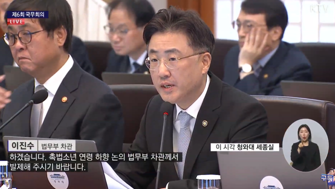 이진수 법무부 차관은 24일 청와대에서 열린 제6회 국무회의에서 촉법소년 연령 하향 논의에 대해 발제했다.
