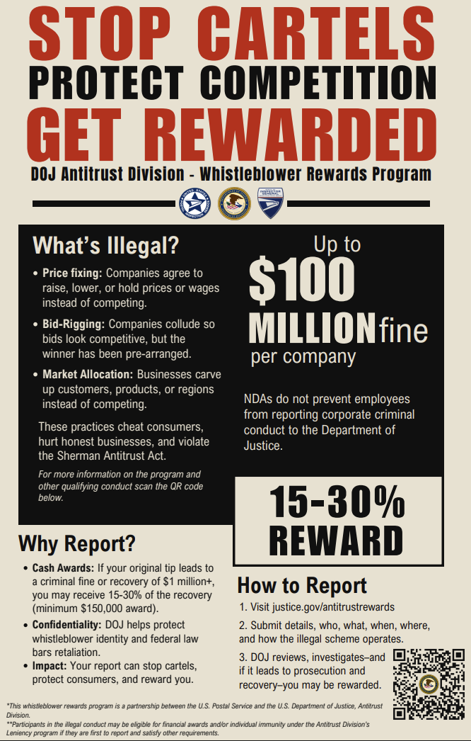 미국의 경우 100만 달러 이상의 담합 벌금을 거둘 경우 벌금액의 15~30%를 한도없이 포상금으로 지급한다.