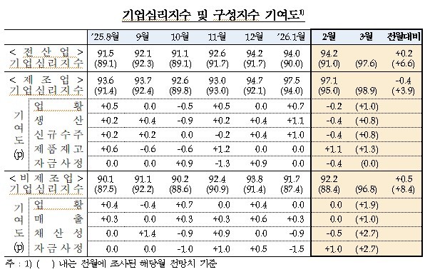 3월 CBSI 전망치는 제조업(98.9)과 비제조업(96.8)이 각각 3.9p, 8.4p씩 오른 것으로 집계됐다. 전산업도 6.6p 오른 97.6으로 나타났다. 이는 2022년 11월(97.6) 이후 3년 4개월 만에 최고 수준이다.