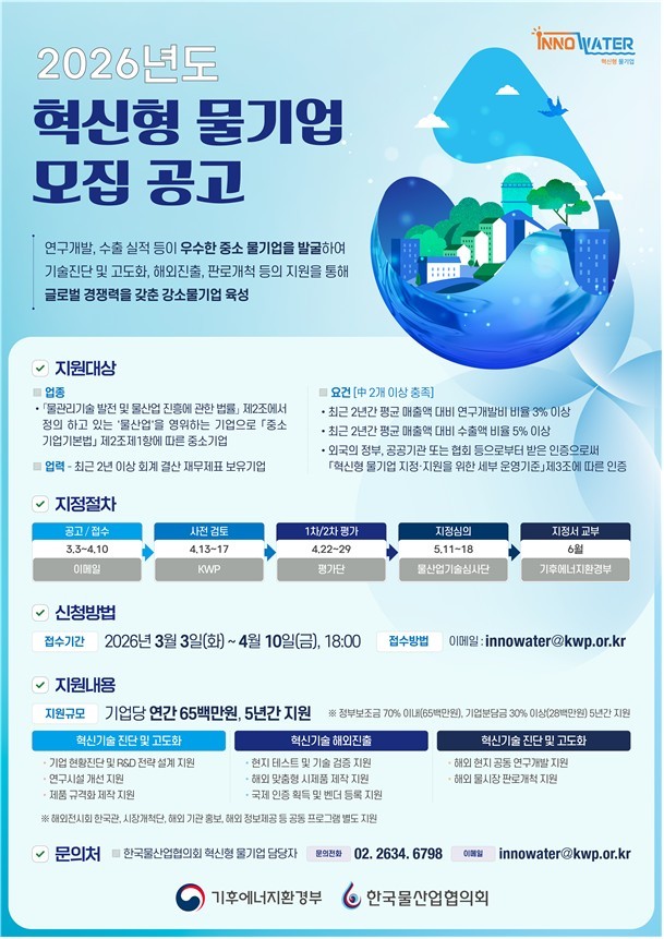 (조세금융신문=최주현 기자) 기후에너지환경부는 제7기 혁신형 물기업 10곳을 3일부터 다음 달 10일까지 공개 모집한다고 2일 밝혔다.