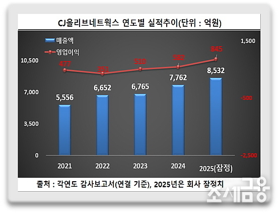 우선 동사의 감사보고서와 지배주주(지분율 100%)인 CJ CGV가 최근 공시한 2025년 4분기 IR보고서에 의거해 매출추이부터 살펴보면, 2021년 5556억, 2022년 6652억, 2023년 6765억, 2024년 7762억, 지난해엔 8532억 원(잠정치)을 시현, 해마다 사상 최대치 행진을 구가중이다.