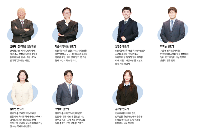 관세청 및 세관에서 약 31년간 봉직하면서 관세·FTA 원산지·외환 분야 전문가인 김용태 관세 전문위원, 다국적 기업인 한국 SM 법무실장과 주요 로펌에서 근무한 이병화 변호사, 국세청에서 16년간 봉직한 설미현 변호사, 검찰에서 봉직한 박은석 변호사와 김철수 변호사 등으로 구성되어 있다.