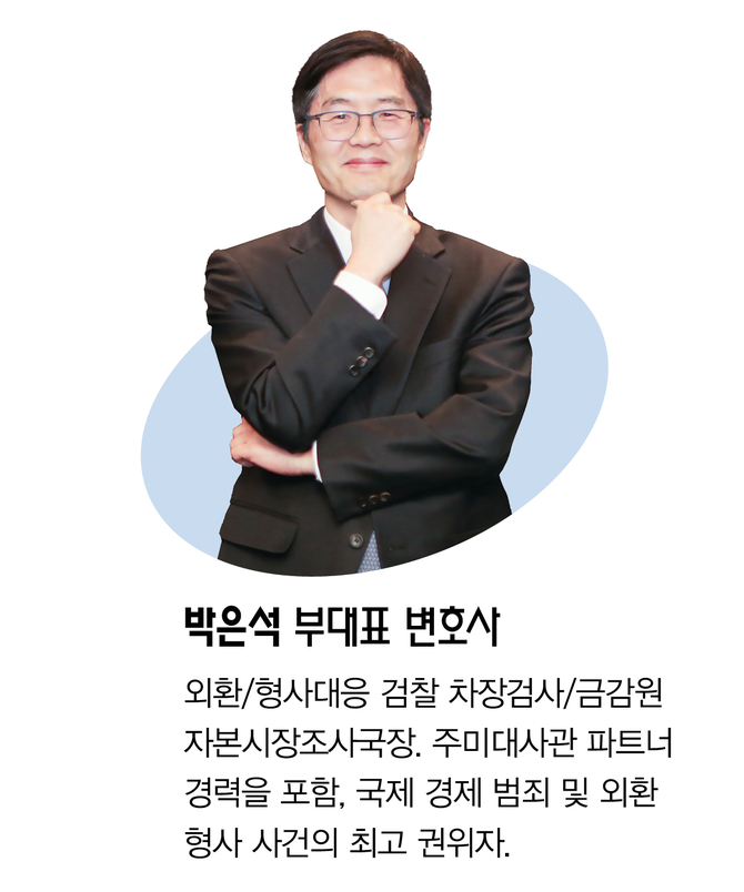 박은석 부대표 변호사(관세·외환형사 전문, 이하 박은석): “21년간 검찰(서울중앙지검 외사부 등)에 서 수많은 외환 사건을 직접 수사했고, 금융감독원에서 4년간 근무하며 규제 당국이 어떻게 외환거래 감독·검사 업무를 수행하는지 이해할 수 있게 되었습니다.