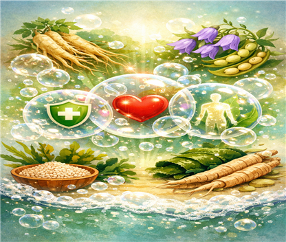 ‘사포닌’이라는 이름에 비누를 뜻하는 라틴어 ‘sapo’가 담겨 있듯, 사포닌을 포함하는 물질은 물에 풀리면 거품을 형성하는 특징이 있다. 사포닌은 인삼, 대추, 콩, 도라지, 더덕, 미역, 다시마, 퀴노아 등에 함유되어 있으며, 겉으로는 거품이 먼저 눈에 띄지만, 그 본질은 우리 몸을 보호하고 균형을 돕는 기능성 성분에 있다.