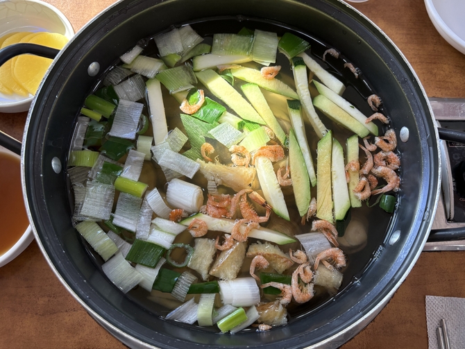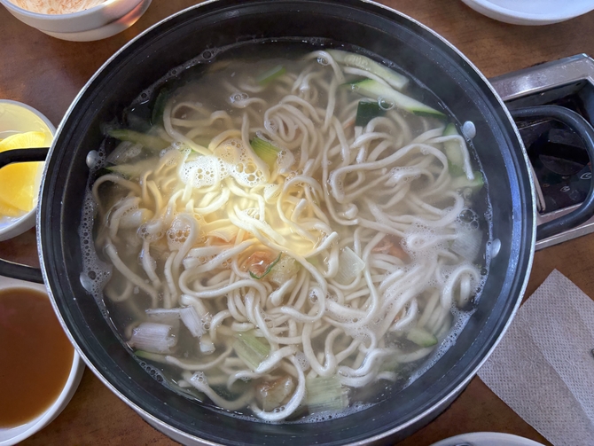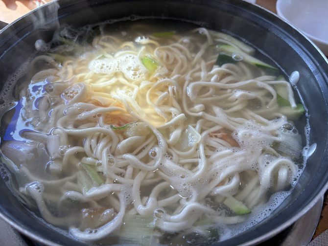 먼저 바지락과 건새우, 애호박 등 채소가 듬뿍 담긴 국물을 끓이고 그 위에 칼국수를 넣어 식탁에서 직접 끓이며 먹는 방식이다.