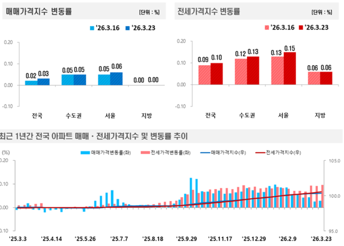 전세 시장 역시 같은 흐름을 뒷받침한다. 같은 기간 전국 전세가격은 0.10%, 서울은 0.15% 상승하며 매매보다 빠른 상승 속도를 보였다.