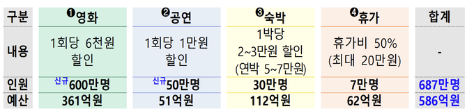 세부적으로는 영화 1회 관람 시 6000원 할인, 공연은 1회당 1만원 할인, 숙박은 1박당 2~3만원, 연박시 5~7만원을 지원한다. 최대 20만원 한도에서 휴가비 50%를 지원한다.