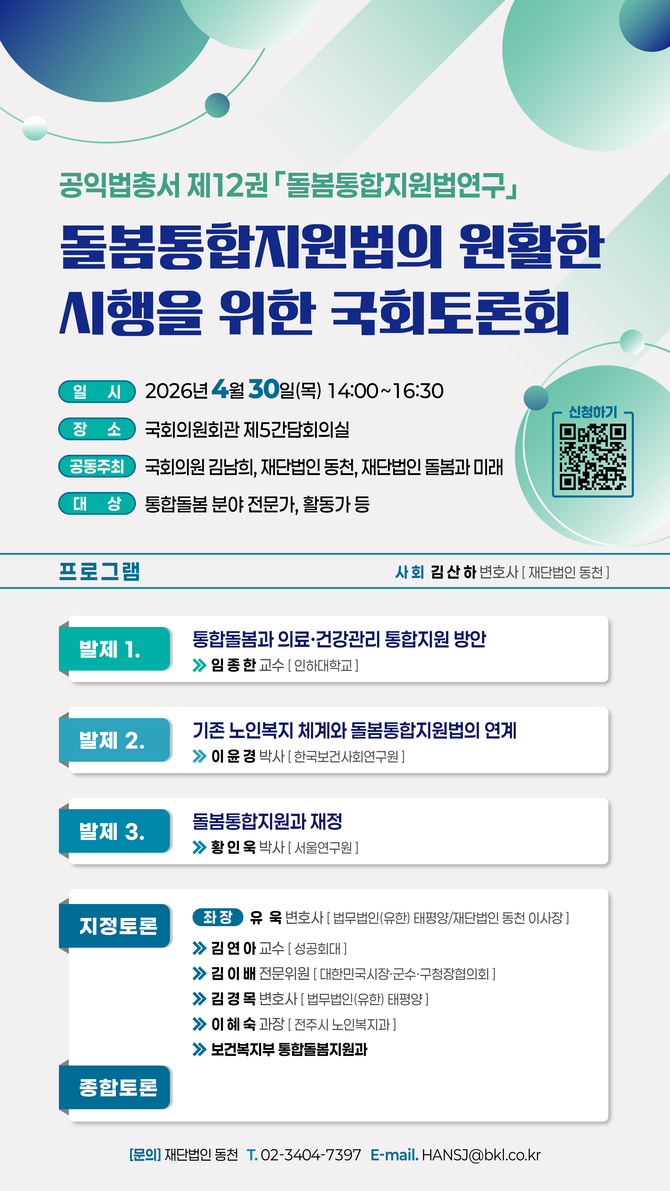 이번 세미나는 재단법인 동천 공익법총서 제12권 ‘돌봄통합지원법연구’를 발간에 앞서 법 시행의 방향과 과제를 함께 짚어본다.