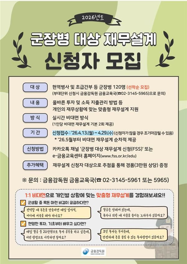 (조세금융신문=송기현 기자) 금융감독원은 '군 장병 맞춤형 재무설계 서비스' 신청자를 오늘(13일)부터 29일까지 선착순 모집한다고 밝혔다.