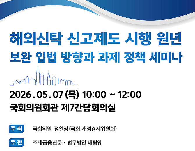 (조세금융신문=고승주 기자) 국회 재정경제기획위원회 소속 정일영 더불어민주당 의원이 다음달 7일 오전 10시 국회의원회관 제7간담회실에서 ‘해외신탁 신고제도 시행 원년-보완 입법 방향과 과제’를 주제로 세미나를 개최한다. 조세금융신문과 법무법인 태평양이 함께 세미나 주관에 나선다.