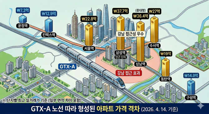 15일 국토교통부 실거래가 공개시스템(2026년 4월 14일 기준)과 단지별 최근 거래 내역을 보면 GTX-A 주요 역세권 아파트 최고 실거래가는 삼성역 인근 ‘대치르엘’ 전용 84㎡가 37억7000만원, 성남 ‘판교푸르지오그랑블’ 전용 103㎡(39평형)가 36억4000만원, 수서 ‘수서한아름’ 전용 97.63㎡가 27억원, 서울역 ‘서울역센트럴자이’ 전용 84.97㎡가 22억8000만원으로 나타났다.