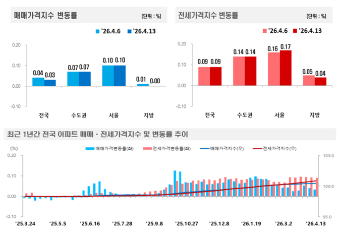 16일 한국부동산원이 발표한 4월 둘째 주 주간 아파트가격동향에 따르면 서울 아파트 매매가격은 전주와 동일한 0.10% 상승을 기록했다. 겉으로는 상승세가 유지됐지만 내부 흐름은 엇갈렸다.