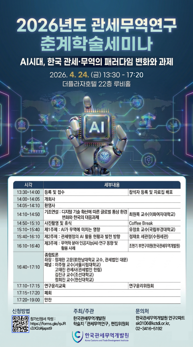 최근 인공지능(AI) 기술이 전 산업에 확산되고 글로벌 통상 환경의 불확실성이 확대됨에 따라, AI 기술이 무역과 관세 행정 전반에 미치는 영향을 학술적·실무적으로 살펴보고 대응 방향을 모색하는 자리가 될 전망이다.