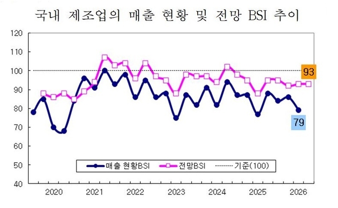 한편, 1분기 제조업 매출 현황 BSI는 79로 전 분기보다 7p 하락했다. 철강(67·-11p), 섬유(65·-11p) 등 소재 부문 업종을 중심으로 부진세가 이어졌고, 무선통신기기(80·-22p), 가전(67·-20p), 바이오ㆍ헬스(73·-19p), 정유(73·-13p), 일반기계(75·-12p), 철강(67·-11p), 섬유(65·-11p) 등 대부분 업종이 하락했다.