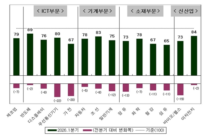 가전(99→84), 일반기계(92→94), 철강(86→88), 무선통신기기(91→92)는 전 분기 대비 전망이 개선됐으나 여전히 기준선을 밑돌았다. 디스플레이(97→86), 정유(87→78), 화학(98→91), 바이오헬스(98→94) 등도 매출 전망이 후퇴했다.