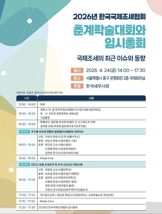 (조세금융신문=김휘도 기자) 사단법인 한국국제조세협회(IFA Korea, 이사장 박훈)는 24일 서울 중구 은행회관 2층 국제회의실에서 2026년 춘계학술대회를 개최했다.