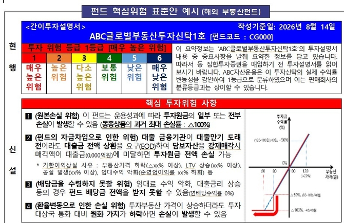 공모펀드의 투자위험 안내 방식도 소비자 눈높이에 맞게 개편된다. 금감원은 간이투자설명서 첫 페이지에 핵심 위험을 요약해 제시하는 '핵심위험 표준안'을 마련한다. 투자자가 주요 리스크를 쉽게 파악할 수 있도록 하기 위해서다.