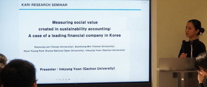 두 번째 발표에선 윤인경 가천대 교수가 ‘지속가능성 회계에서 창출된 사회적 가치 측정: 한국의 선도적인 금융 기업 사례(Measuring social value created in sustainability accounting: A case of a leading financial company in Korea : 이호영, 민순홍, 박현영, 윤인경)’을 발표했다.