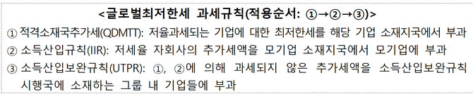 글로벌 최저한세는 다국적기업그룹이 전 세계에서 납부한 법인세 실효세율이 15% 미만인 경우 15%를 충당할 때까지 그 부족분을 매출 수준 등에 비추어 모기업 및 그룹 내 다른 기업이 소재한 국가에서 과세권을 갖는 제도를 말한다.