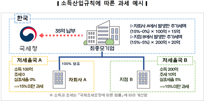 2024년 사업연도에는 소득산입규칙에 따라 해외 자회사나 지점이 법인세 실효세율이 15% 미만이라면, 국내 모기업은 우리나라에 추가세액배분액을 신고·납부해야 한다.