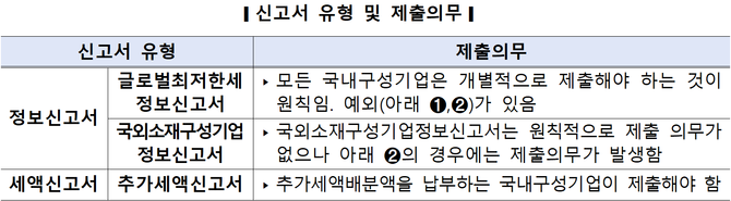 글로벌 최저한세 정보신고서 제출 예외 대상이라도 국외 소재 구성기업 정보신고서는 국내 제출해야 한다.