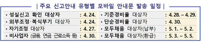국세청(청장 임광현)은 지난 24일부터 신고 대상자 1333만명에 순차적으로 신고 안내문을 카카오톡, 네이버 전자문서, 문자메시지로 보내고 있으며, 모바일 안내문을 받지 못한 납세자에게는 서면 안내문을 발송하겠다고 29일 밝혔다.