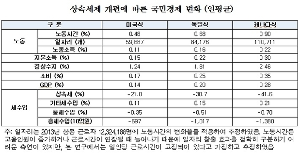 한경연은 상속세 개편이 고용, 경상수지, 내수, 국내총생산(GDP) 등 국민경제에 긍정적인 영향을 미치는 것으로 분석했다.