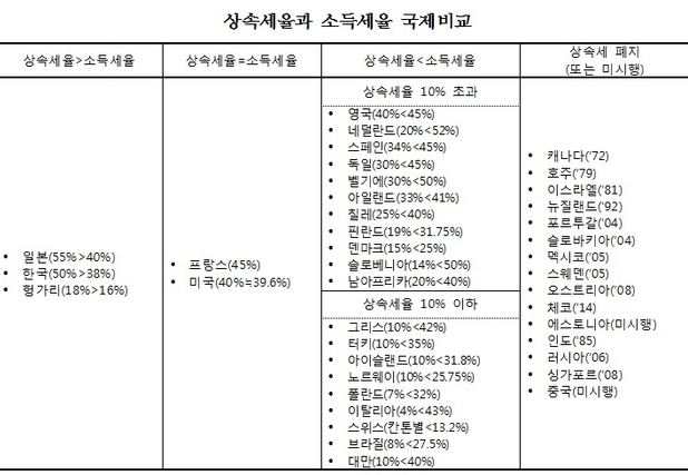 한편 대부분 국가들과 달리 상속세율을 소득세율보다 높게 유지하는 국가는 한국, 일본, 헝가리 3개국 뿐이다. 우리나라의 상속세 최고세율은 50%로 일본 55%보다 낮지만 대주주 할증액을 포함할 경우 65%에 달하고, 소득세와의 격차도 27%p로 세계 최고수준에 해당한다.