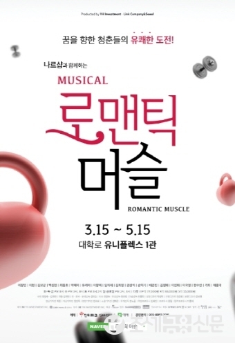 (조세금융신문=김명진 기자) 뮤지컬 <로맨틱 머슬>이 3월 15일부터 5월 15일까지 대학로 유니플렉스 1관 무대에 오른다.‘머슬’과 ‘건강’을 뮤지컬에 접목시킨 이 작품은 머슬 퍼포먼스 대회에서 한 팀으로 참가한 재기, 준수, 윤서가 발레와 머슬이 결합된 퍼포먼스에 도전하면서 시작된다.