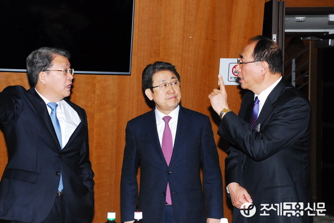 (조세금융신문=김필주 기자) '2017 전국 세무관서장 회의'에서 쉬는 시간 중 담소를 나누는 임환수 국세청장(좌측), 김봉래 차장(가운데), 신동렬 대전청장(우측)