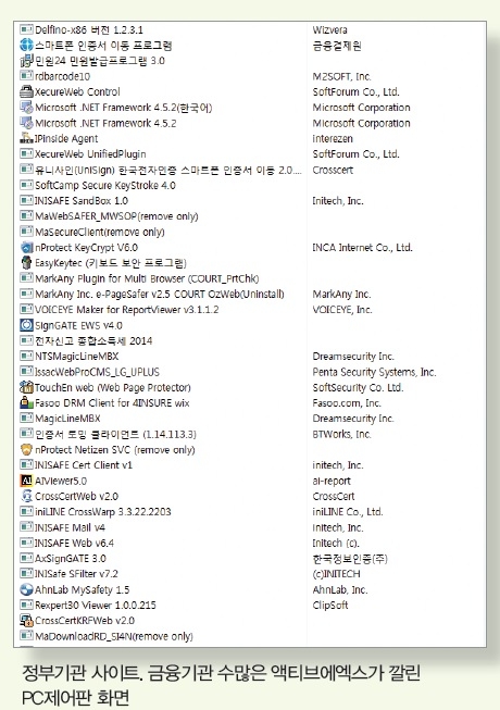 조사 결과 건강보험공단은 22개, 국세청 홈택스는 19개, 인터넷 우체국은 12개, 민원24는 7개의 액티브엑스를 이용 중인 것으로 파악됐다.
