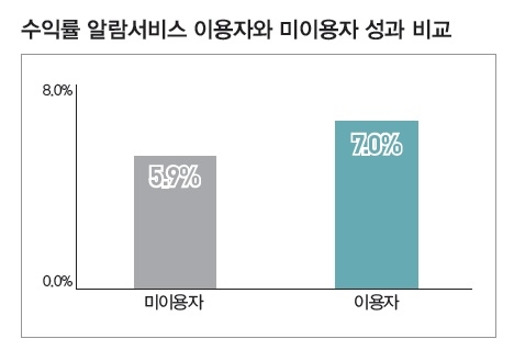 수익률 알람서비스를 이용하지 않는 30,501개 계좌의 평균 기간수익률은 5.9%였으며, 수익률 알람서비스를 이용하는 2,304개 계좌의 기간수익률은 7.0%로 수익률 알람서비스를 이용하는 고객군 수익률이 1% 가량 높은 것으로 나타났다. (※2017.4.13. 고객별 기간수익률 기준)