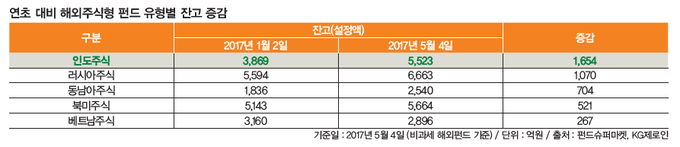 증시가 좋은 모습을 보이며 펀드시장에서도 인도에 대한 관심이 고스란히 이어지고 있다. 연초 후 인도 펀드로 1,654억 원이 유입되며 러시아펀드(1,070억 원)를 제치고 해외주식형 펀드 가운데 국가별로는 가장 많은 투자자금이 쏠리고 있다.