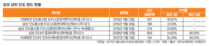 온라인 펀드전문 증권사로 각광받고 있는 펀드슈퍼마켓에서 인도에 투자하고 있는 개별펀드를 살펴보면 미래에셋과 삼성자산운용의 운용성과가 돋보인다. 특히 인도의 증시상승에 중소형 주식들이 견인차 역할을 하면서, 중소형펀드의 성과가 높게 나타나고 있다.