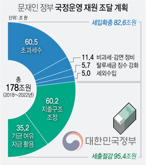 이와 관련한 문재인 정부는 세출절감으로 5년간 95조4천억원을 마련키로 했다. 세입확충을 통해서는 82조6천억원을 조달할 계획이다.