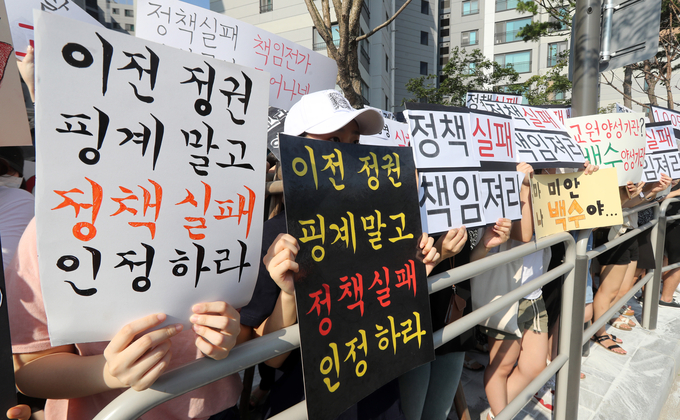 4일 서울 종로구 서울교육청 앞에서 이화여대 등 서울지역 교대생들이 2018학년도 초등교사 선발 인원 대폭 축소에 항의하며 손팻말을 들고 침묵시위를 벌이고 있다.