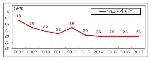 세계경제포럼(WEF)이 매년 발표하는 국가경쟁력 평가에서 한국이 올해 137개국 중 26위를 차지했다. 한국의 순위는 2014년∼2017년 4년 연속으로 제자리 걸음했다.