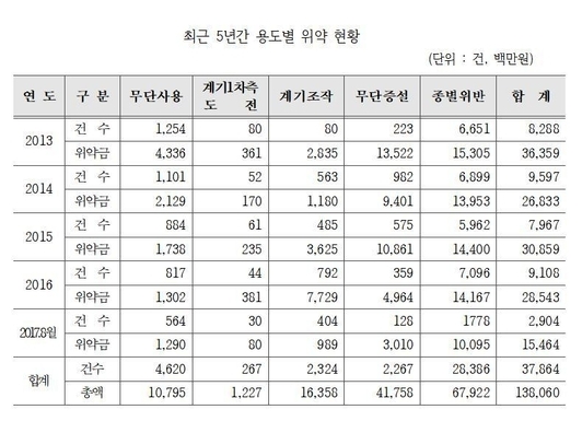 가장 많은 위약사례는 전체 75% 비중을 차지한 종별위반으로 2만8386건이 적발돼 679억원이 부과됐다. 이어서 ▲무단증설 2267건 418억원 ▲계기조작 2324건 164억원 ▲전기 무단사용이 4620건 108억원 ▲계기1차측 도전 267건 12억원 순으로 나타났다.