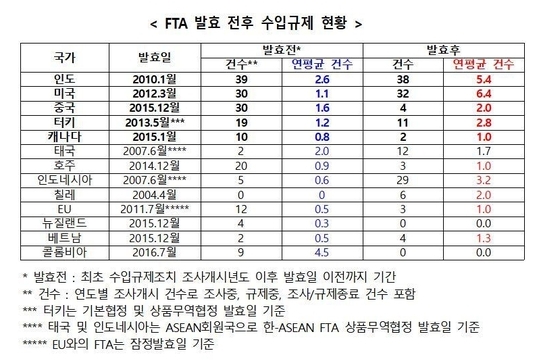 우리나라와 FTA를 체결한 국가들을 대상으로 FTA 발효 전후 수입규제 조사개시 건수를 비교한 결과 인도는 발효 전인 지난 1995년부터 2009년까지 39건, 연평균 2.6건이었으나 발효 후인 지난 2010부터 2017년까지는 38건, 연평균 5.4건으로 2배 이상 증가했다.